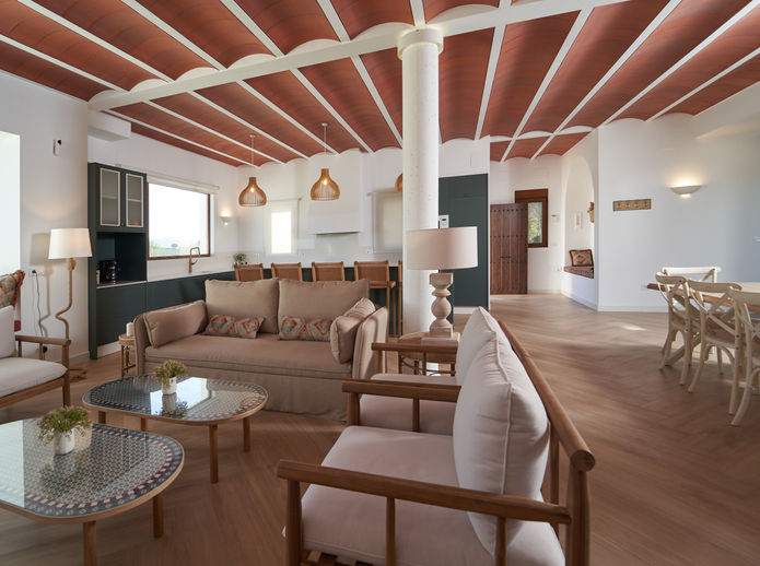 Este espacio del Cortijo Fuente Serena, el salón ofrece un ambiente cálido con su chimenea de piedra, vigas de madera y cómodos sofás. La cocina, totalmente equipada, combina estilo rústico y funcionalidad moderna. El comedor, con su gran mesa de madera y vistas al paisaje andaluz, es perfecto para disfrutar de momentos inolvidables.